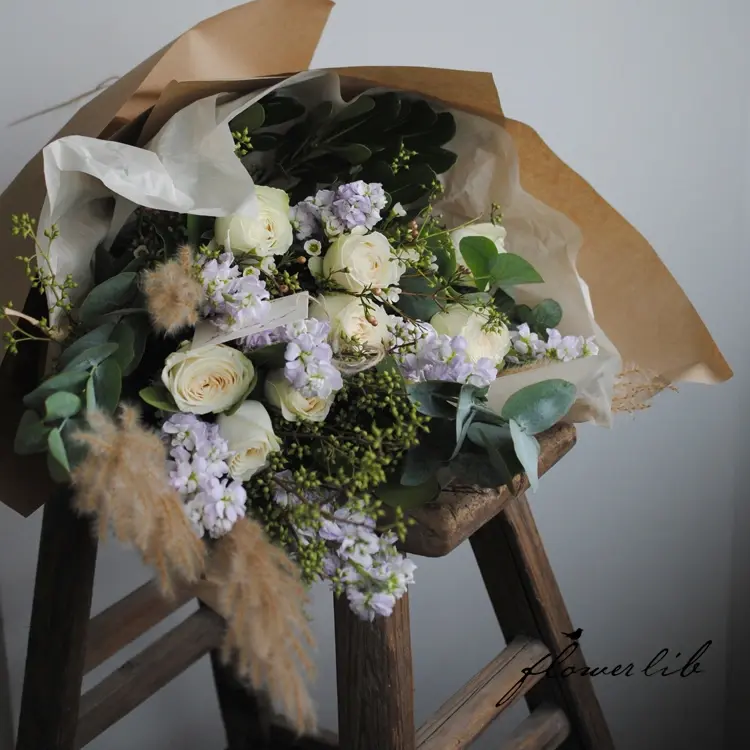 白玫瑰 + 尤加利的組合,傳遞「平安順遂、願你放寬心」的溫柔;淺紫色洋桔梗因「堅韌、治癒」的花語,適合探病或安慰失意的朋友;小雛菊(白色 / 淺黃)則像「小太陽」,寓意「難關總會過去,保持希望」。